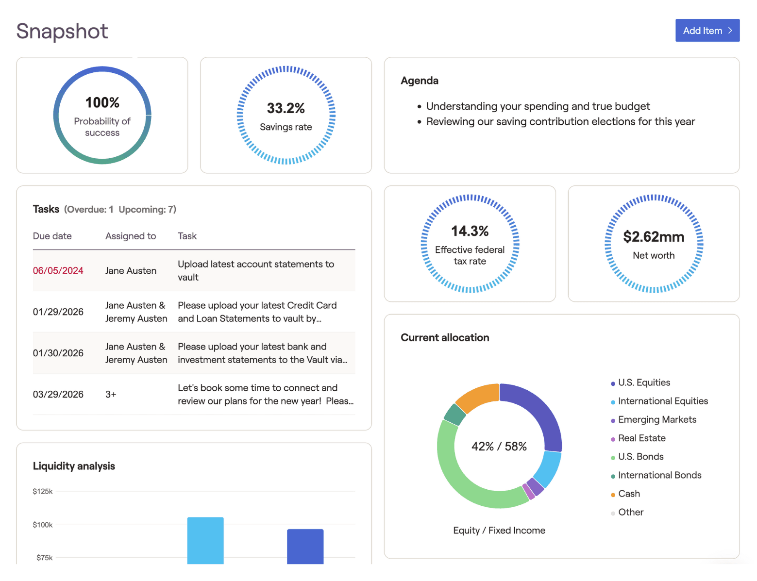 Snapshot lives inside the client’s Dashboard module and functions as a curated set of widgets pulling key visuals and info from all over a client’s financial plan. Here’s some examples on how to tailor each layout to each client or group of clients: