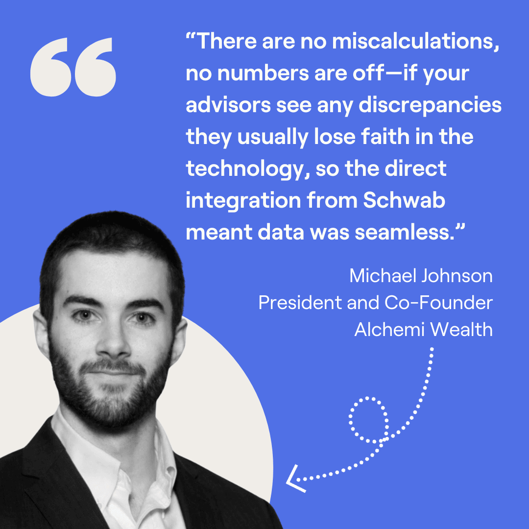 To reduce data entry time, set up your integrations. According to the most recent Ezra Group WealthTech Integration Score, RightCapital holds the highest score across financial planning software. With more than 40 integrations available, you can connect directly to CRMs, analytics platforms, custodians, clearing firms, and more. It was with the Schwab integration, for example, that Alchemi Wealth was able to successfully migrate 900 clients.